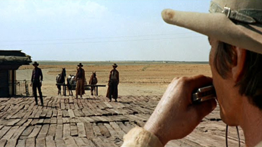 Leone didn’t simply direct Westerns; by combining the ugly with the beautiful, the evil with the good, the present with the past he created art. A scene in Once that takes place in a sleazy saloon in the middle of the desert, where bounty hunters and filthy horsemen sit drinking and spitting, is a perfect place to introduce us the real nature of Claudia Cardinale’s character, the gorgeous Jill, a frightened yet strong woman that will face any man that stands in her way. How does the man behind the camera do it? Close-ups. That’s Leone’s trademark and something that went on and influenced later famous directors like Quentin Tarantino and John Woo. It made him recognizable. We see a close-up and we immediately know it’s him. And again it’s the attention to detail that shapes this movie. In American Westerns, well respected directors like John Ford or Howard Hawks would never use close-ups because they felt the West was all about the posture and strong figure of cowboys, muscular lawmen. Leone had his own idea. His focus was on the slight movements, barely visible tics, a tear in the corner of the eye. Leone’s details tell us more about a character than any form of dialog. In Once we have the mysterious character of Harmonica, played by legendary Charles Bronson, we know nothing about him and yet he’s one of the main characters of the movie. In that same saloon scene, Leone directs a close-up of Harmonica’s face while the man plays a tune on his silver instrument. We ask ourselves what’s the meaning of this close-up? And I say precisely that: the audience asking themselves a question. We raise questions because we’re curious and Leone delivers the answers with the same close-up at the very end of the movie, letting us finally discover the character’s identity, motivation and dark past. You’ll never play harmonica again.
