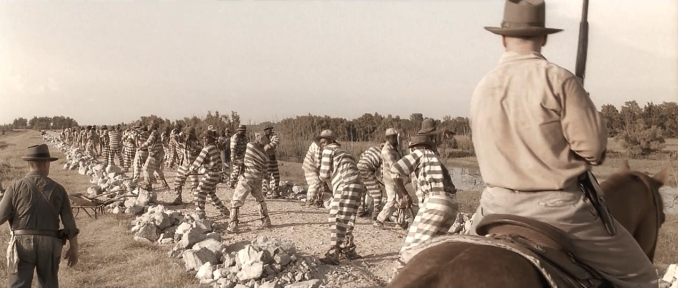 Labeled as a comedy, the film starts off with the sound of hammers beating on rocks, the voices of black prisoners chanting; we open up to a chain-gang. Hundreds of prisoners slamming their hammers against the dusty ground, guarded by armed deputies, under the heavy sunlight, dressed in plain striped uniforms, singing. The sepia cinematography by master Roger Deakins is used here to make us reflect on the whole situation right from the opening: prisoners, guards, in colour they’re all the same, it’s the politics that divide them. One holds a sledgehammer, the other a loaded rifle.