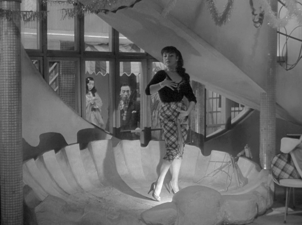 Street of Shame is a film about prostitutes in the Red Light District of Tokyo as the country is trying to pass an anti-prostitution bill. Dreamland, the brothel which houses the women, is a place cut off from the rest of the world, a place that, if entered, offers different sets of rules that do not necessarily apply to the external world. For one, family members are not allowed inside, and clients who visit regularly are nothing but strangers when stumbled into outside the brothel’s doors. Dreamland is a place of endless debt: the women that work there are all in debt to each other and ultimately, to their pimp and manager. Their money is subject to increasing interest rates and is, in a way, what prevents them from leaving this place. The women working at Dreamland are, like in all of Mizoguchi films, real, fleshed-out characters: aging mothers still supporting their grown-up children, devoted wives working tirelessly to pay rent for their unemployed husbands, teenagers running away from home, hoping to make a name for themselves. Their evident differences in age, background and beauty are often subject to fights, acts of betrayal and feelings of hopelessness and despair in the face of a society that treats them purely based on one thing – their bodies. This society, having been driven to the ground by the devastating effects of war, now desperately trying to come back from the dead, has created and consistently reinforced a culture of misogyny, where it is okay for these women to openly admit to themselves ”I’m nothing but an object for sale.”