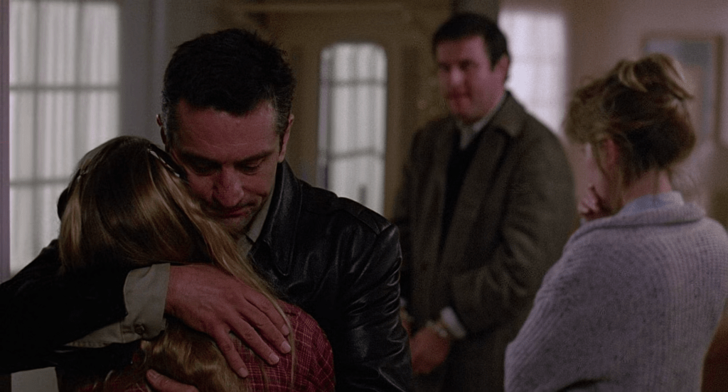 All of a sudden, a little girl emerges. It turns out it’s De Niro’s daughter. As soon as she enters the frame, the bickering stops and De Niro freezes. He hasn’t seen this child in nine years, and now she’s all grown up. He can barely say, ”What grade are you in now?” and when she replies that she is in eighth grade, all he can blurt out is, ”Eighth grade, huh…” Grodin smiles at the sight of this, and the two actors beautifully capture the fragility of this scene. In the midst of a storm, there is a sudden glimmer of light and calm. This little girl, De Niro’s daughter, stands with her eyes doing all the talking for her. You used to be part of my life, she thinks. How come you’re not anymore?