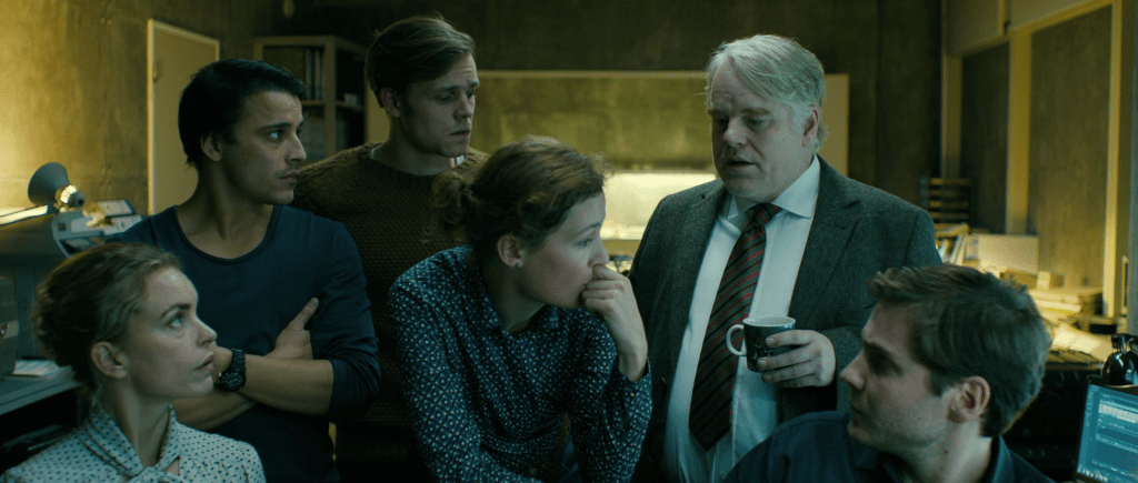 Bachmann is a master manipulator, however this ‘skill’ comes at a price, namely he walks through life without savoring it. The metallic look of the film suggests just that: here we have a man who in principle works for our safety, but this means he cannot look at something and not consider it a possible danger to society. To Bachmann, bars are places where people conspire, a man hugging a woman certainly hints at an exchange of precious information, a man walking his dog down the street is nothing but an actor playing his part, every phone call is dialed with the intent of blowing up a bomb somewhere. This one-dimensional, grim outlook on life makes of Seymour Hoffman’s character a fascinating protagonist as we ultimately don’t know what he truly believes in. In a scene where Bachmann presents his mission to his superiors and members of German security and American diplomats, the American (played by Robin Wright) asks him: “What’s the objective?”, to which Bachmann answers “To make the world a safer place.” He follows this up by giving it a shrug, shaking his head as if to say, Yeah, I know. How crazy is that?