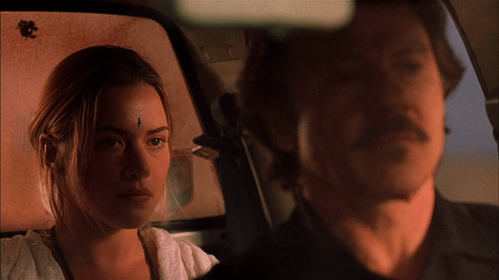 Winslet’s character of Ruth is a young, vibrant person who goes soul-searching in India. Her life is based on instinctive decisions. Her vision of the world matches the vision of a privileged white person who finds meaning in places where people cannot afford a meal. In her own blissful ignorance, Ruth is the opposite of PJ (Keitel’s character). The American cult deprogrammer is a master manipulator, an aging, self-assured mustached asshole with a passion for deprogramming young women. The kind of man who, when accused by Ruth of being a misogynist, replies, “I don’t hate women, I love ladies!”