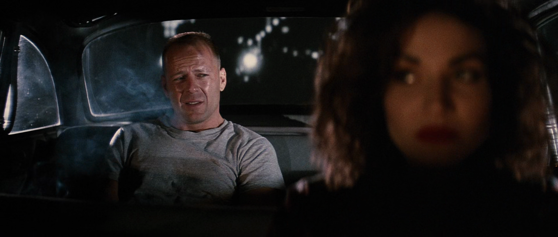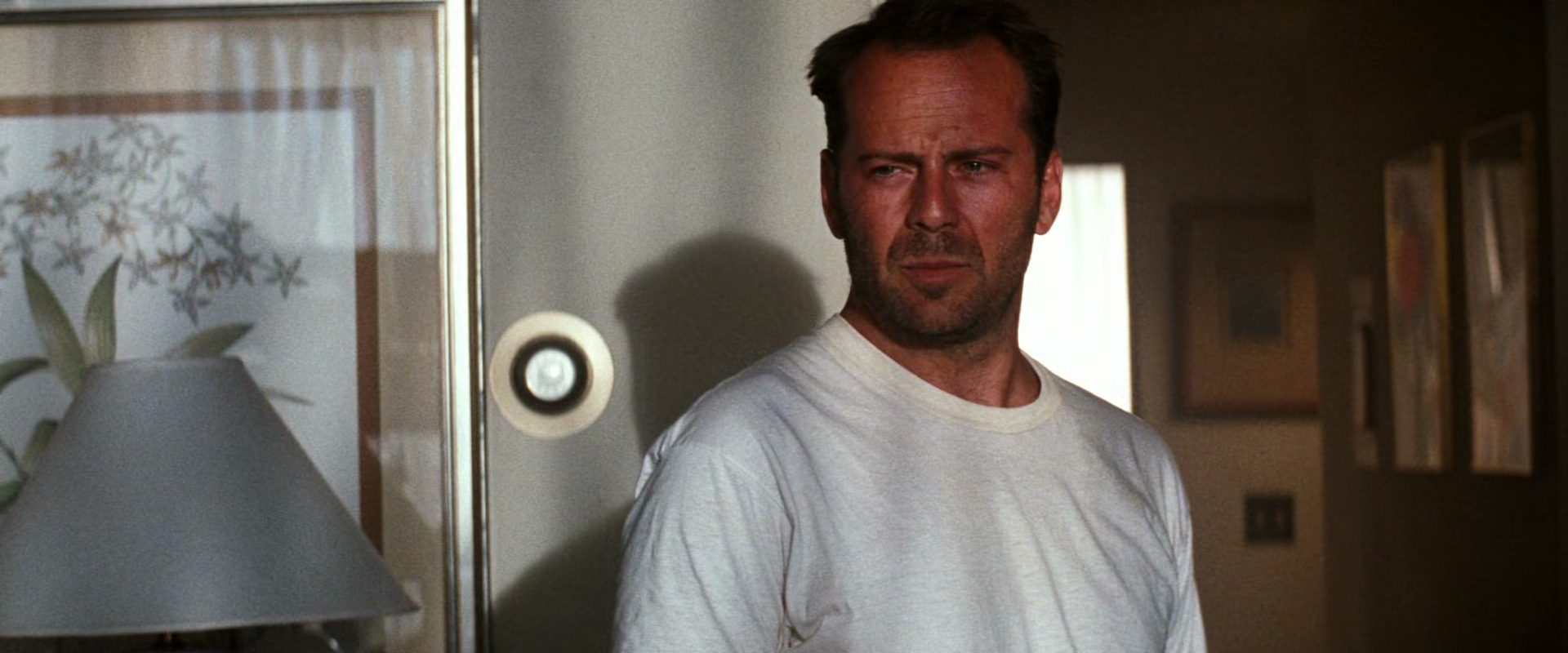 Three of my favorite performances of his attest to the fact that Willis could be great whenever the material he worked with alluded to his blue-collar swagger. The characters he portrayed didn’t need to be superheroes, didn’t need capes and fake muscles. In The Last Boy Scout, directed by Tony Scott, Willis portrays the ultimate heroic fuck-up – Joe Hallenbeck; an ex-secret-service agent turned private eye whose wife is screwing his best friend and whose own daughter calls him an asshole. Hallenbeck has very little respect for himself. Upon waking up in his car with a massive hangover, the detective looks at his own reflection in the rear-view mirror and says to himself, “Nobody likes you, everybody hates you. You’re gonna lose. Smile, you fuck.” This little opening scene, in a way, encapsulates the essence of a Bruce Willis protagonist.