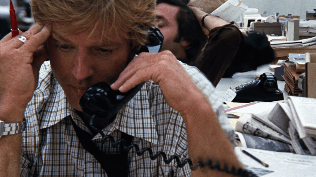 It is precisely the ambiguity that permeates Pakula and legendary cinematographer Gordon Willis’ frames which makes All the President’s Men so incredibly fleshed out and immersive. The camera lurks and gets up close as our protagonists appear in seemingly simple situations. A scene that is only composed of one slow tracking shot as Robert Redford talks on the phone with a couple of sources turns out to be one of the most thrilling sequences in all of 1970s cinema. It is so entrancing that even when Redford experiences a slip of the tongue and gets a name wrong, we hardly notice it, or rather, it completely belongs to the story the film is telling. Even someone as cool as Redford can make a mistake while reciting a script during a nerve-wracking phone call, and Pakula’s camera captures it with a sense of spontaneity that makes the scene that much more credible.