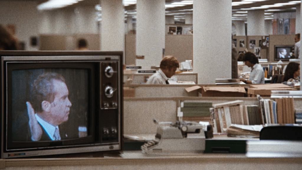 Another important consideration to be made with regards to the movie’s critique of the establishment is the portrayal of television as a powerful ally to the establishment. Unlike the newsroom, where the hustle and bustle of the sweaty and foul-mouthed reporters results in concrete attempts at revealing some form of truth, television in Pakula’s film acts as the wicked mouthpiece protecting the interests of the powerful. Television sets are dispersed around the Washington Post‘s newsroom, presenting a counterfactual reality to the one Woodward and Bernstein are trying to unmask. Every attempt of theirs to try and get closer to the answers fuels the television’s tendency to relay the government’s version of the facts, adjusting their line of thought according to instructions from above. As Dustin Hoffman beats on his typewriter and Redford continues to bother potential sources on the telephone, the television plays in the foreground, showcasing the loud, incessant status quo. Once again, the film is not as straightforward to suggest that evil also stems from the power of television, but it hints at something more ominous and harder to define. It is that ambiguity, that lack of security, the uncertainty of the instruments we’re willing to bet our life on that contributes to the danger we’re exposed to on a daily basis – the danger of never getting close the truth. Is there hope? Well, yes – as long as the guy with the sweaty shirts and loosened collars continue to type away.