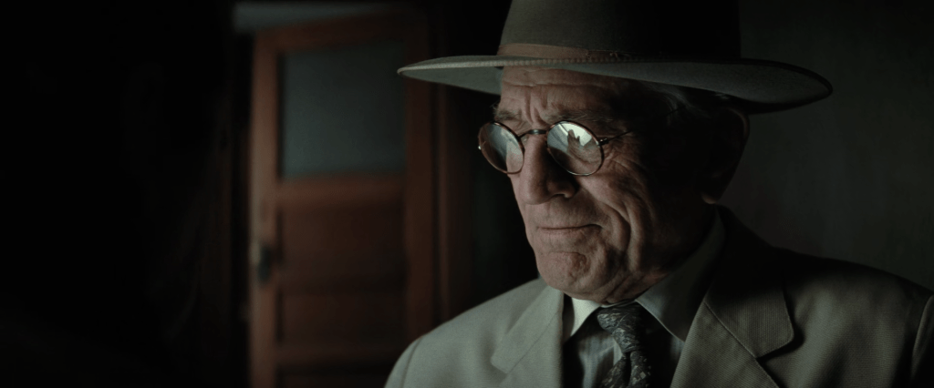 Upon rewatching Killers of the Flower Moon, I noticed how restrained De Niro’s physicality is, how the actor barely moves on screen as William Hale. He lets silences and looks do the work. Scorsese shoots his long-time partner with mostly steady shots, paying close attention to Hale’s reactions to his surroundings. Hale is the Owl, aware of everything and everybody, and the Osage believe that once you see an owl approach you in your dreams, it means death is knocking at your door. Hale embodies this impending doom, but unlike in Alan Parker’s Angel Heart from 1987 where he played the Devil complete with creepy fingernails, black attire and a weirdo ponytail, De Niro never makes the plunge into ridicule or grotesque.