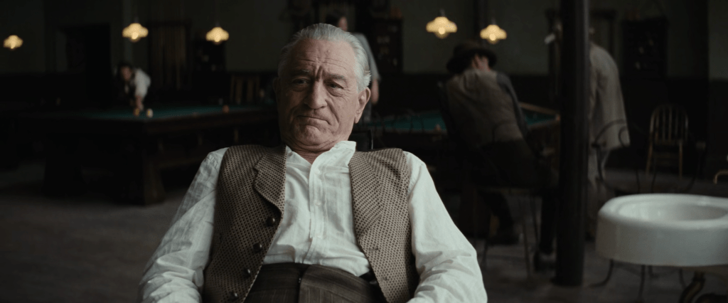 De Niro’s nuanced and subtle turn makes everyone complicit. There is not a single moment that his behavior is meant to alienate us. Instead, his cold blooded and calculated demeaner sucks you into Hale’s schemes. There is no outrage. There is no crying, screaming. There is none of the emotional release we’ve come to expect from the actor who gave so many instances of emotional vulnerability in Raging Bull, Mission or Deer Hunter, among others. In Killers, his character’s observations are so simple, so crystal clear despite their murderous nature. Critics of the film seem to have failed to understand that the focus – due to Scorsese’s own acknowledged sense of a limited white man’s perspective – is on the enabling of the killers, on the ease with which the entire homicidal plot is put into motion by someone as ordinary as Hale – a loving father, uncle and grandfather – and the absolute complicity of a town, a community and a nation that was built on similar instances of widespread bloodshed. Hale – through De Niro’s silent stare – is not the exception, but the rule. He is the model, the example to follow in the eyes of men and women who still to this day fail to question the realities of our world, because in Hale’s view – he’s merely doing what the situation requires of him.