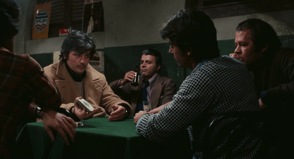 In Zurlini’s film Delon is still able to evoke the sense that Dominici has already gotten a taste of this cruelty and abandon, he’s had his fair share of it, perhaps even contributing to it in his own way, in some distant realm of the past which we now have no access to. He willingly goes to places crowded with the same kind of people that he says he despises. He surrounds himself with the vilest, most insecure men, all guilty of treating women like dirt, and doesn’t make it a secret when he befriends one of them, nicknamed Spider (played by a very young Giancarlo Giannini), and mostly uses him to run errands for him.