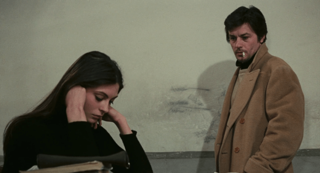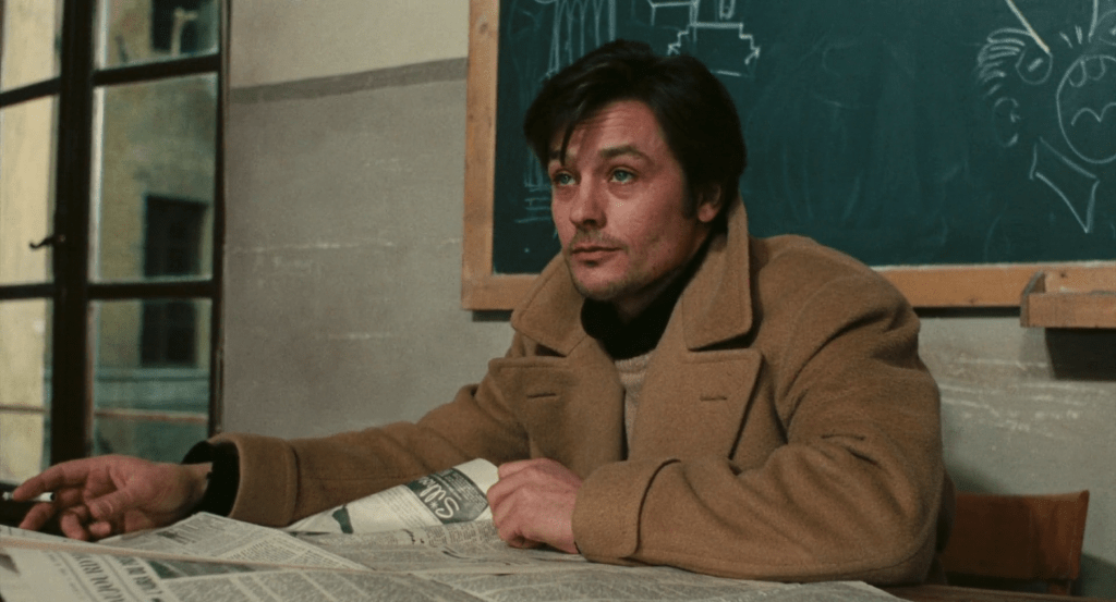 “I am here to explain why one of Petrarca’s verses is lovely, and I think I can do it well,” Delon’s professor Dominici tells the classroom on his first day at the school. “All the rest bores me. Red or black, you are all the same. The black ones are more stupid.” Dominici says it without emphasis: it is all one flat stream of words that he utters with a cigarette dangling from his lips – a habit we’ll come to expect from him as he spends the rest of the movie perpetually toying around with cigarette butts. Cigarettes – the act of lighting them, giving life to an inanimate object – is perhaps the only certainty left in Dominici’s otherwise empty life.