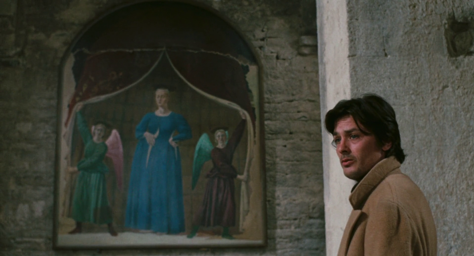 The meanness is, however, at odds with Dominici’s sensitivity and love for poetry. These are the domains that speak to his heart. He appears just as amazed at the sight of a Renaissance painting as he is when walking through the halls of a decrepit, abandoned country house that used to belong to friends of his family. Despite his perpetual sense of ennui, Delon’s character is capable of wonder and passion. Perhaps he’d rather live without it, as he knows that his life will never be able to reflect such beauty, such long-lasting vitality. “She is aware but not happy,” Dominici notes while looking at the Madonna del Parto painting by Piero della Francesca in Monterchi. “Maybe she senses that the mysterious life growing inside of her will end up on a Roman cross, like that of a wrongdoer.” He says this not only in awe of the painting, but more so in awe of the Virgin Mary’s courage in the face of her tragic predicament. The world cannot be hopeless for as long as such courage exists. Dominici knows this, and perhaps that is why he hides out in Rimini – out of shame for his cowardice.