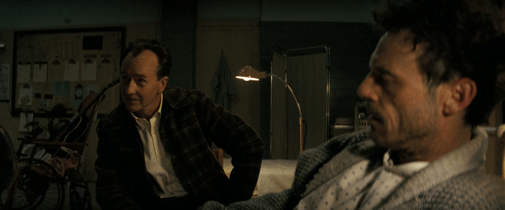 At first, Chalamet’s performance as Dylan appears borderline cartoonish. He grunts and mumbles and in the moments where you expect him to come through clearly, boldly, he does the opposite and shrinks, almost disappears off the screen, allowing everyone else to crowd him. But over the course of the movie’s runtime that becomes the focal point of Mangold’s picture: the overbearing agendas hanging over a kid who just wants to write and play his own music. The entire point of Dylan coming to New York is to see his idol, Woody Guthrie, who is dying in a hospital. His purpose is as simple as that. And yet, people can see that there is more to him. That the gods have placed their truths inside this human vessel. This prophet who appears at the right place, at the right time. That is the case for his mentor, Pete Seeger (played by Edward Norton), who immediately tries to impose his world view on Dylan – that real music is folk music, a good song does not require any frills in order to be good, that rock ‘n roll does not serve any higher purpose than mere entertainment. “Yeah, but it sounds good,” replies Dylan.