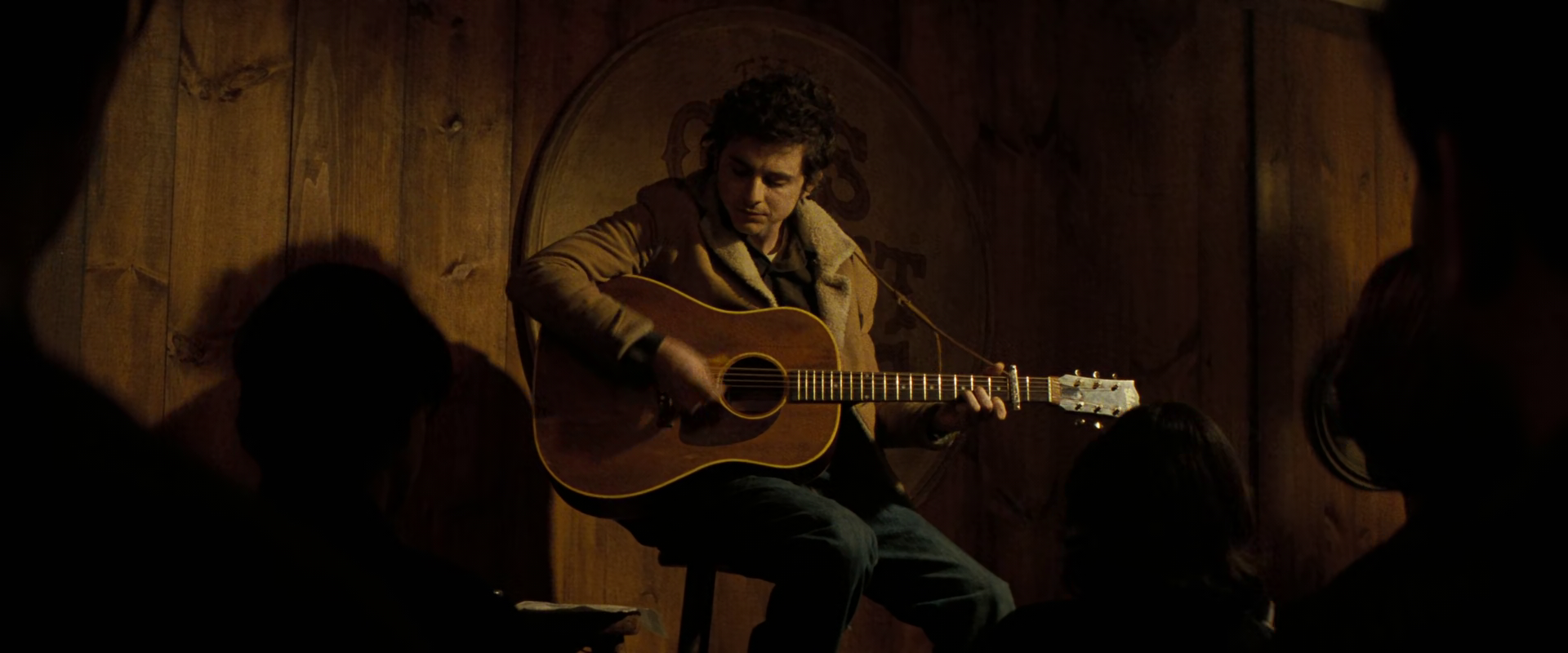 And that is how A Complete Unknown starts: with a vague impression of a young kid with a guitar, starved for a fulfilling, successful career. Right from get-go we know what Dylan wants, and that is to be great. He appears before us like a vision with no place to call home. When asked where he’s from he only says “The Midwest” before proceeding to tell stories about how he toured the country with a carnival. That’s as close as we are going to get to the truth with Dylan.