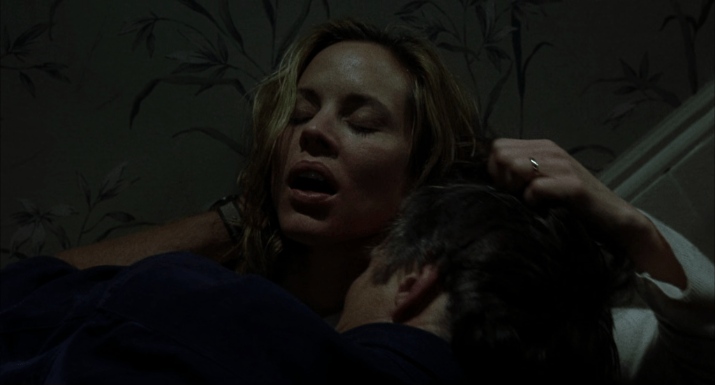 The film contains two scenes of physical intimacy between Tom and his wife, Edie. The first one being the married couple coming together on a night that sees them in a state of teenage euphoria, Tom’s wife literally putting on her high school cheerleader costume, ‘welcoming’ him into her own past. The scene is tender and playful yet also comically cliché – once again, Cronenberg simulates the American way of life depicted in most movies without shaming his characters’ feelings. The scene ends with the husband and wife holding each other in a sleepy embrace, professing their love in gentle whispers.